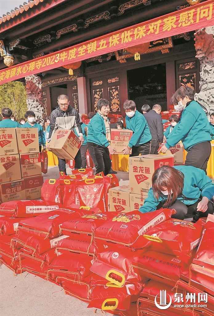 當天上午9點不到,安海鎮各村的代表早早來到水心禪寺。多年來,臘月十六已成了水心禪寺和全鎮低保戶、五保戶“相約”的日子,每年的這一天都會為全鎮低保戶、五保戶發放米和油,讓大家過個暖心好年。低保戶每戶一袋20斤的大米和一桶10斤的油,五保戶在此基礎上再加一個500元的紅包。當天共為全鎮1312戶低保戶和189戶五保戶發放禮包。自2001年以來,該寺已連續20多年對全鎮低保、五保對象予以慰問。