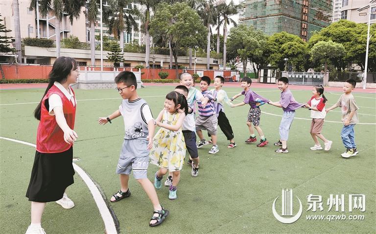 7月8日,在豐澤區第三實驗小學內,參加職工子女暑托班的孩子們在志愿者的帶領下進行課間游戲。(融媒體記者張九強 攝)