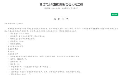 開展農(nóng)村集體資產(chǎn)資源摸底調(diào)查工作,指導(dǎo)各村梳理可盤活流轉(zhuǎn)的資產(chǎn)資源、可入場交易的村級建設(shè)類及服務(wù)類項目清單;聯(lián)合市農(nóng)村產(chǎn)權(quán)流轉(zhuǎn)交易服務(wù)中心配置村級信息員,從交易需求形成到交易完成全程提供協(xié)助,降低村級交易人力成本;積極引導(dǎo)項目進(jìn)場交易。8月26日,永和鎮(zhèn)旦厝村村委會大樓二樓(掛牌號:2024001)率先進(jìn)入泉州市農(nóng)村產(chǎn)權(quán)流轉(zhuǎn)交易平臺,成為該平臺上線后首宗掛牌項目。
