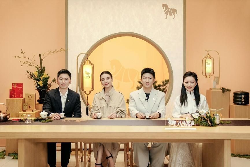 圖為著名演員、八馬茶業(yè)品牌大使宋佳(左二),知名主持人張大大(右二),八馬茶業(yè)聯(lián)席總經(jīng)理王焜恒(左一),八馬茶敘主理人王佳佳(右一)共同亮相“八馬茶敘·團(tuán)圓佳夜”直播間