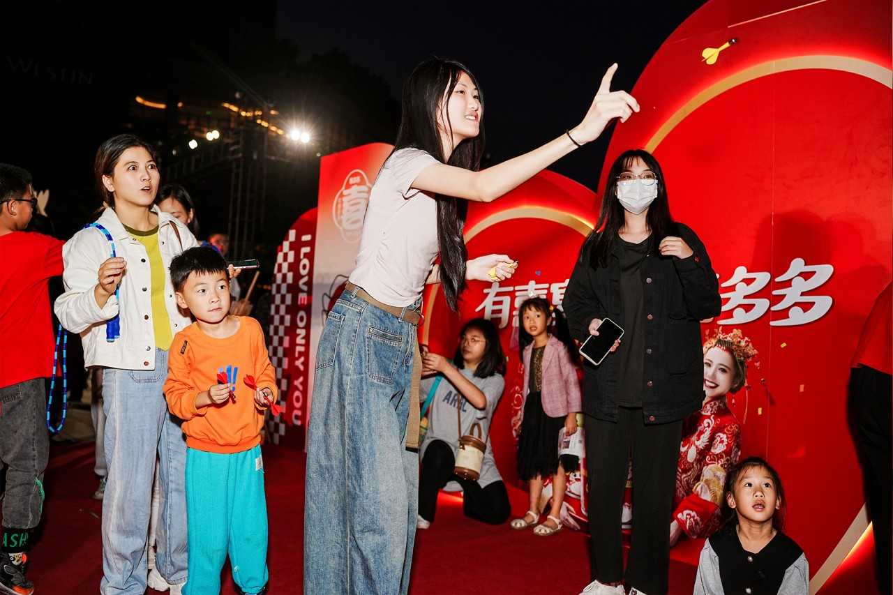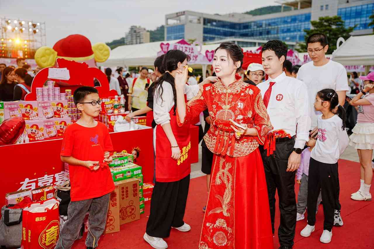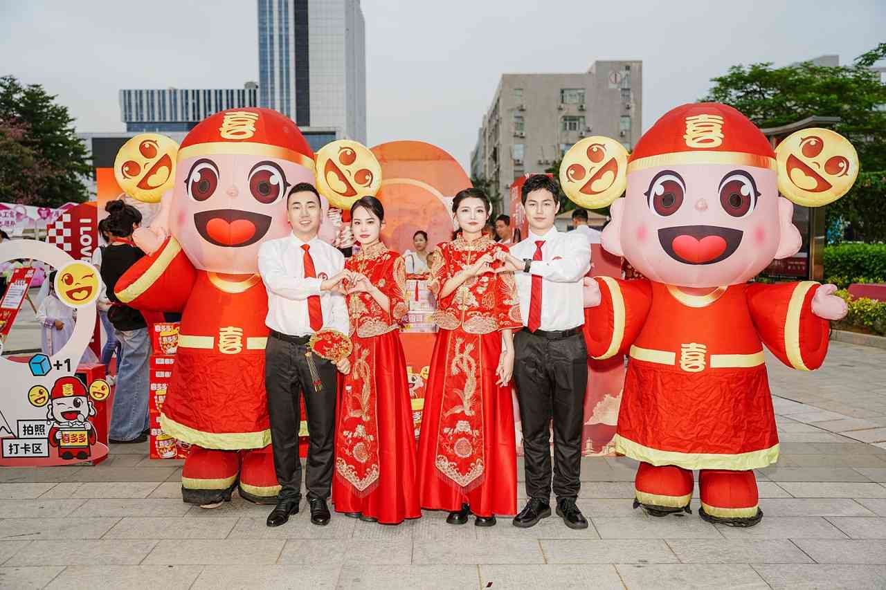 幸福的模樣紛繁多樣,集體婚典的戀愛集市中,處處洋溢著溫馨與喜悅。喜神化身幸福使者,穿梭于人群之間,與新人、觀眾互動拍照,將喜氣傳遞給每一個人。喜多多還在活動現場精心設置了試吃體驗區和小游戲互動區,吸引新人、觀眾駐足參與,為整個婚典增添了豐富多元的體驗。