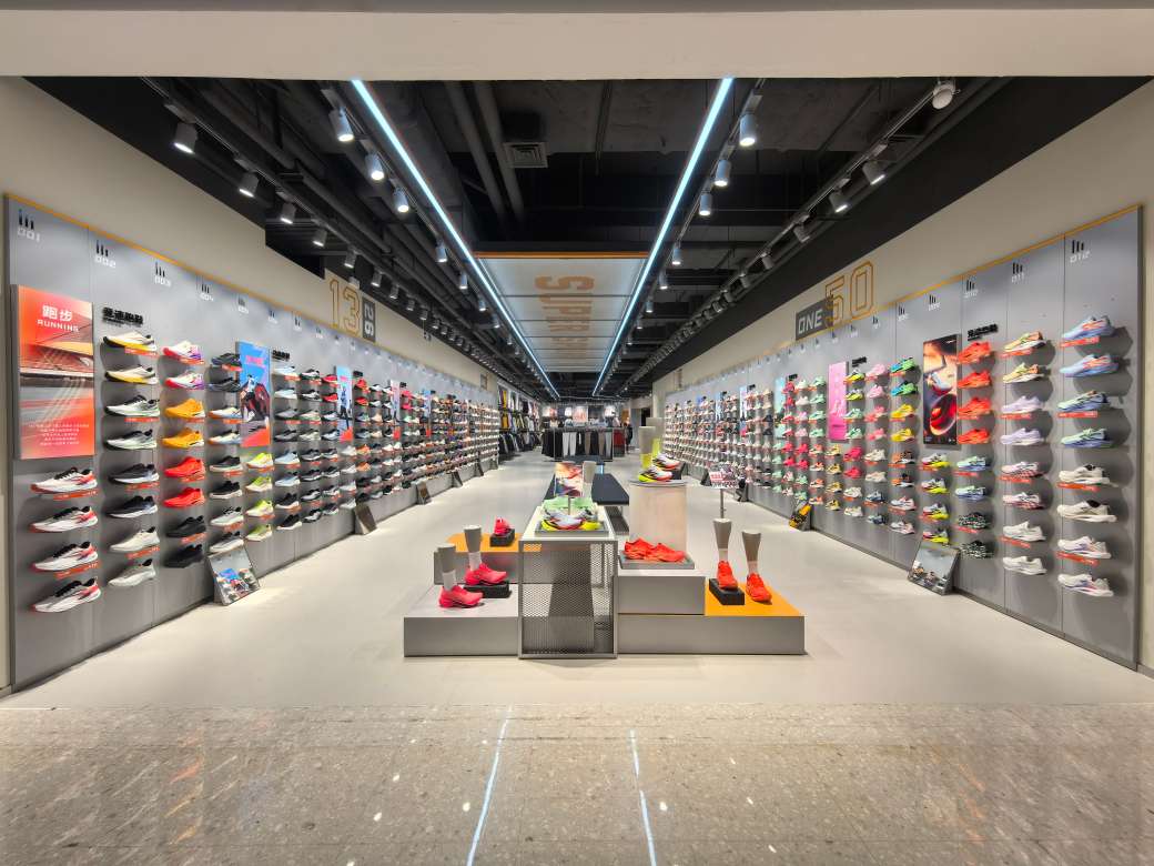 品類覆蓋則打破邊界,從四季商品到全年齡段需求一應俱全。除了涵蓋跑步、籃球、綜訓、運動生活等常規品類外,還囊括網球等新品類。尖貨SKU數量較大多數常規店更多,例如跑鞋細分為競速、功能、通勤、日常四大系列,休閑鞋劃分為復古文化鞋與經典板鞋。尖貨SKU如“飛飚2”“飛燃4”等熱門配色集中陳列,搭配國旗款羽絨服等差異化產品,有效滿足全年齡段客群在不同場景的裝備需求。同時,配合店內靈活促銷的策略吸引客流,實現“質價比雙優”的消費自由。而自助掃碼購、電子價簽等數字化手段簡化流程,10-12名店員即可高效運營超大空間,減少消費者決策時間。這種“自助式購物”模式不僅降低運營成本,更讓“即買即走”的體驗成為可能。