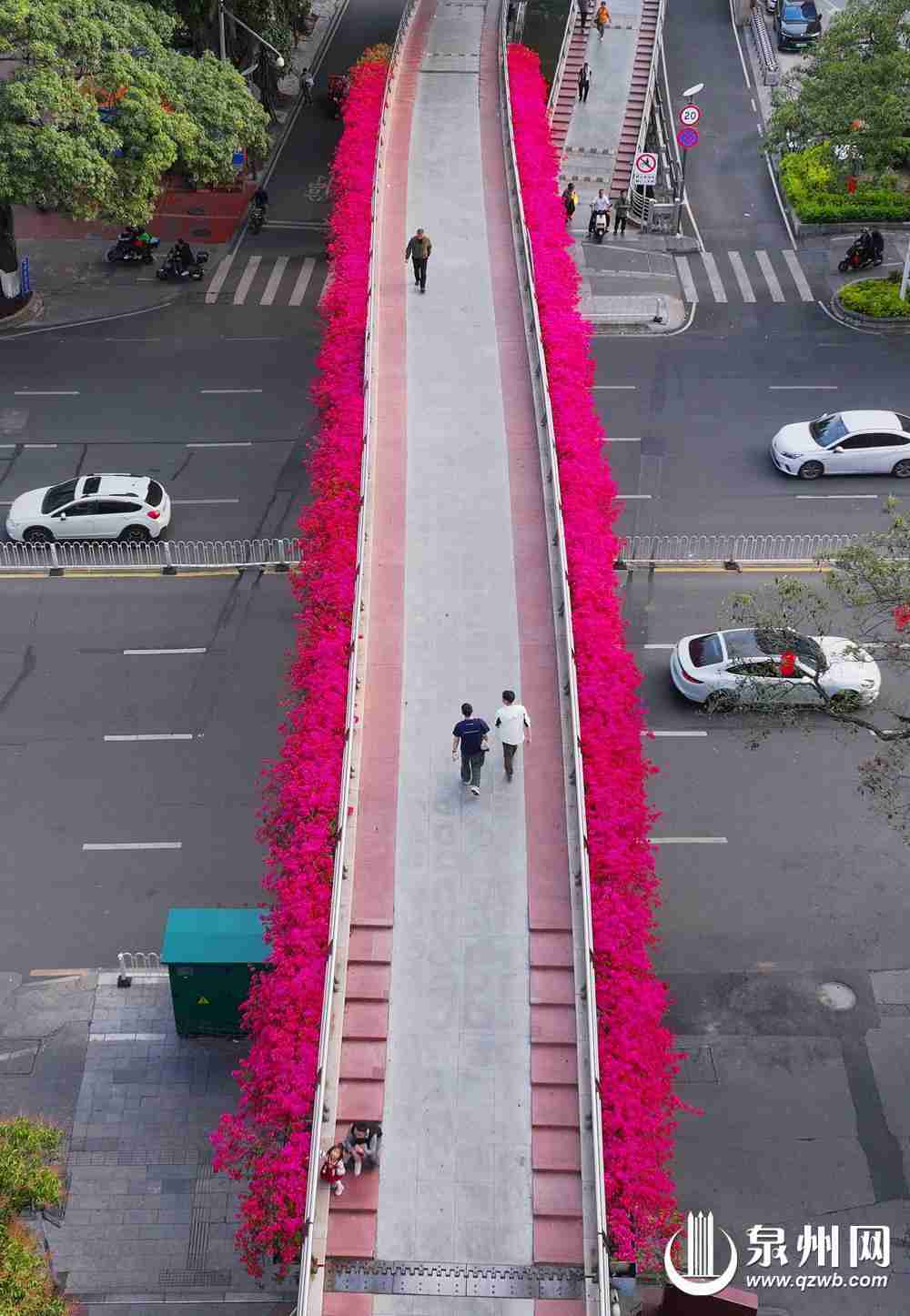 鬧市街頭,一橋飛架而過,橋上護欄里的三角梅在四月的春風里迎風怒放,仿佛給橋身穿上一件火紅的披風……這就是位于市區豐澤街兒童醫院南側的跨街天橋,更是被網友譽為“最美簪花天橋”。
