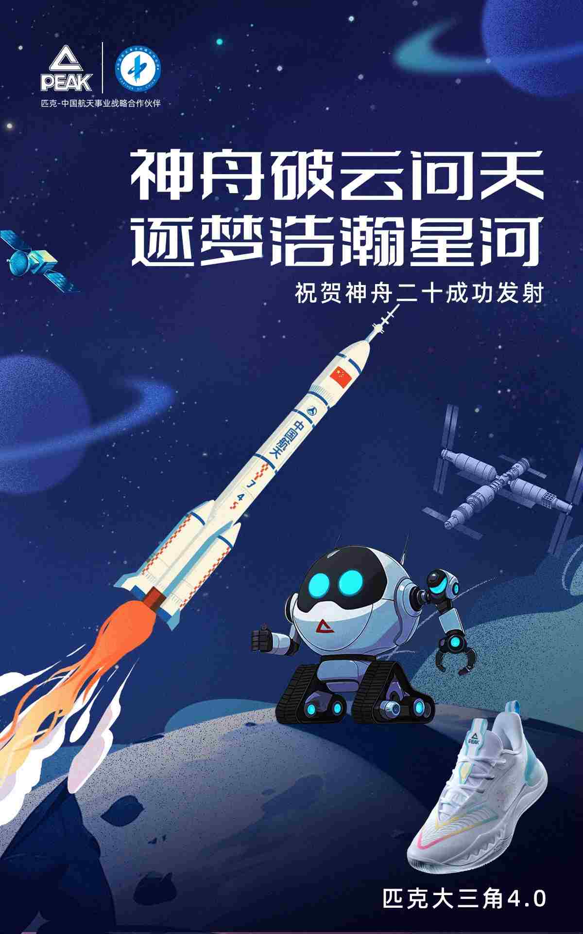 作為運動裝備行業(yè)首家“中國航天事業(yè)戰(zhàn)略合作伙伴”,匹克體育與中國航天的合作始于2005年。從神舟六號載人飛船的騰飛,到嫦娥探月工程的壯麗征程,匹克一路見證著中國航天事業(yè)的輝煌跨越。同時,匹克將科技創(chuàng)新作為核心動力,將航天精神深度融入品牌基因,不斷推動自身發(fā)展。