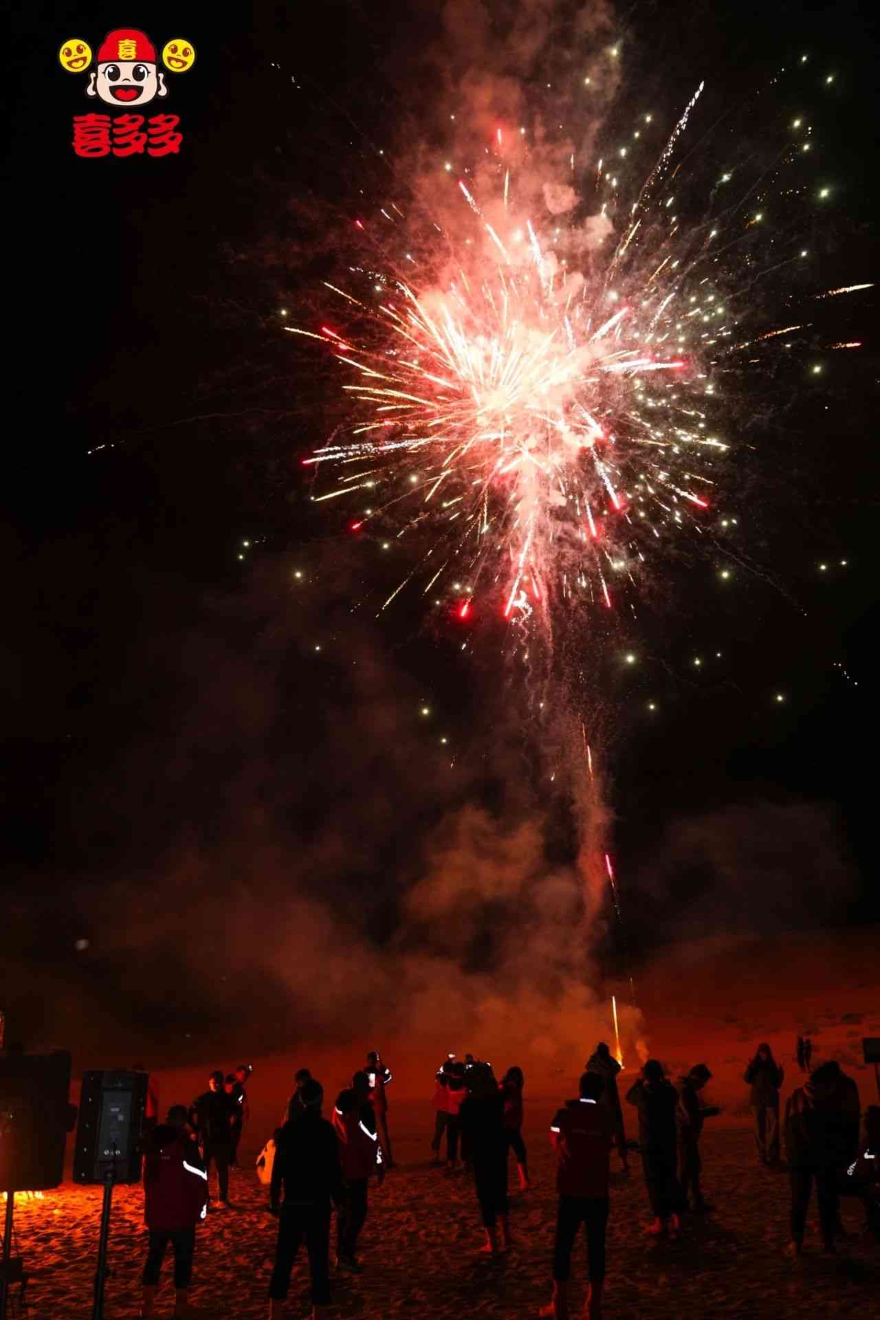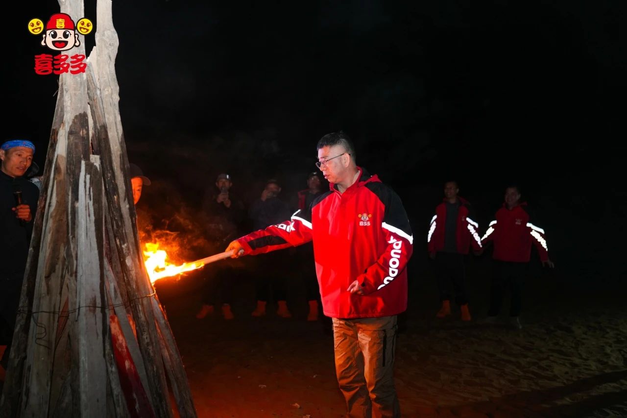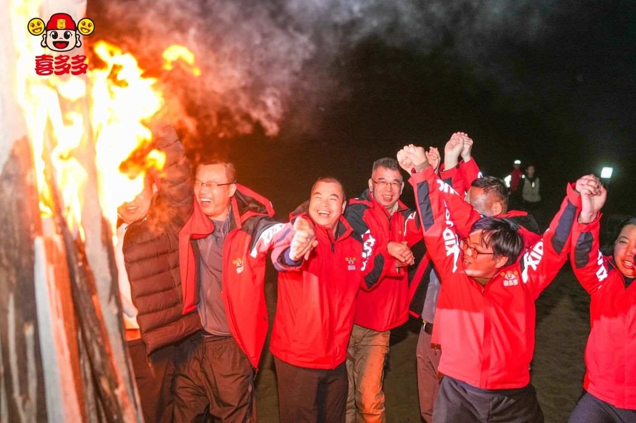 暮色將至,騰格里沙漠被夜色籠罩,一場璀璨的煙花盛宴驟然登場。喜多多集團董事長許慶純走向篝火堆,將手中的火把點燃干柴,火焰沖天而起,恰似點燃了大家心中蟄伏已久的斗志。