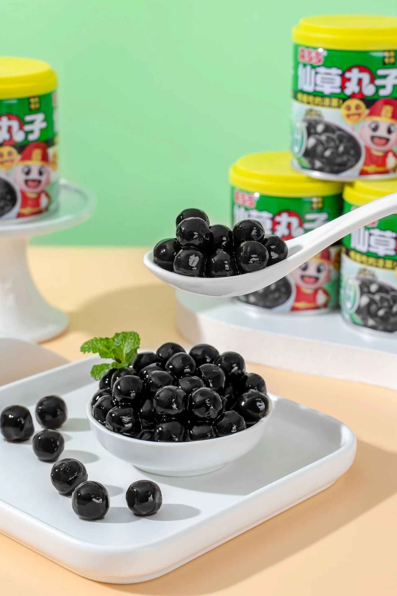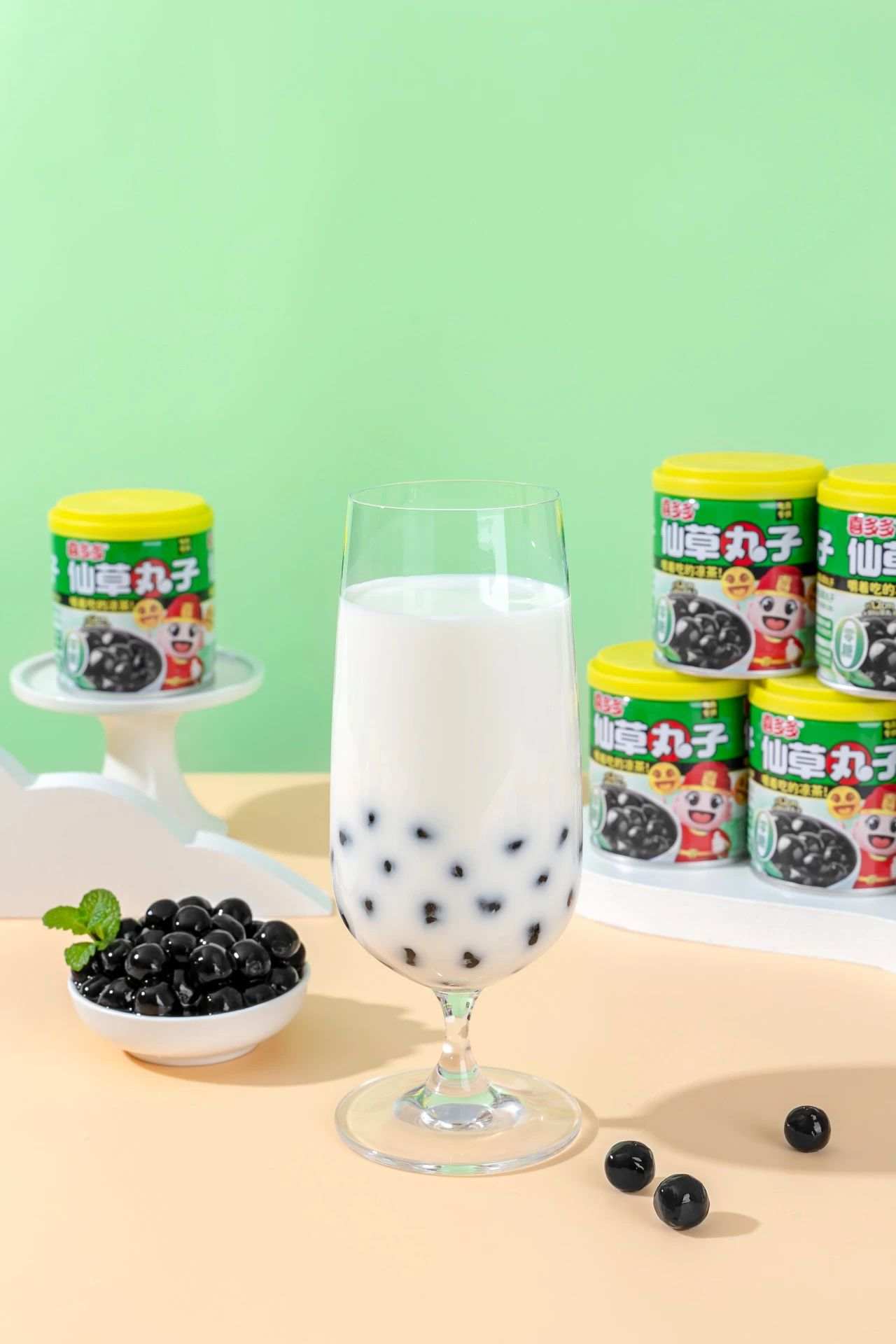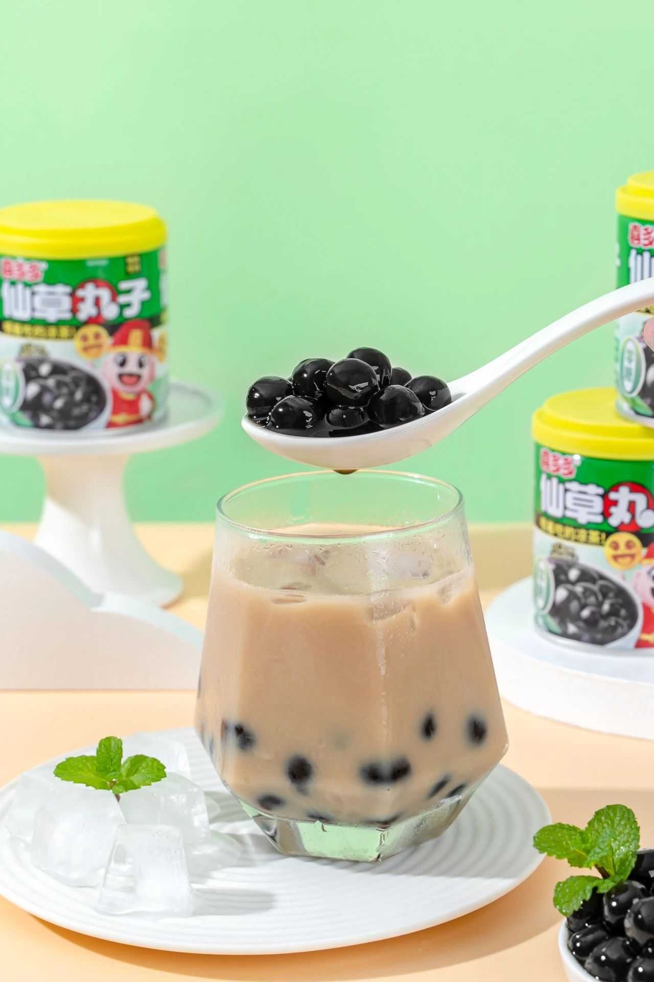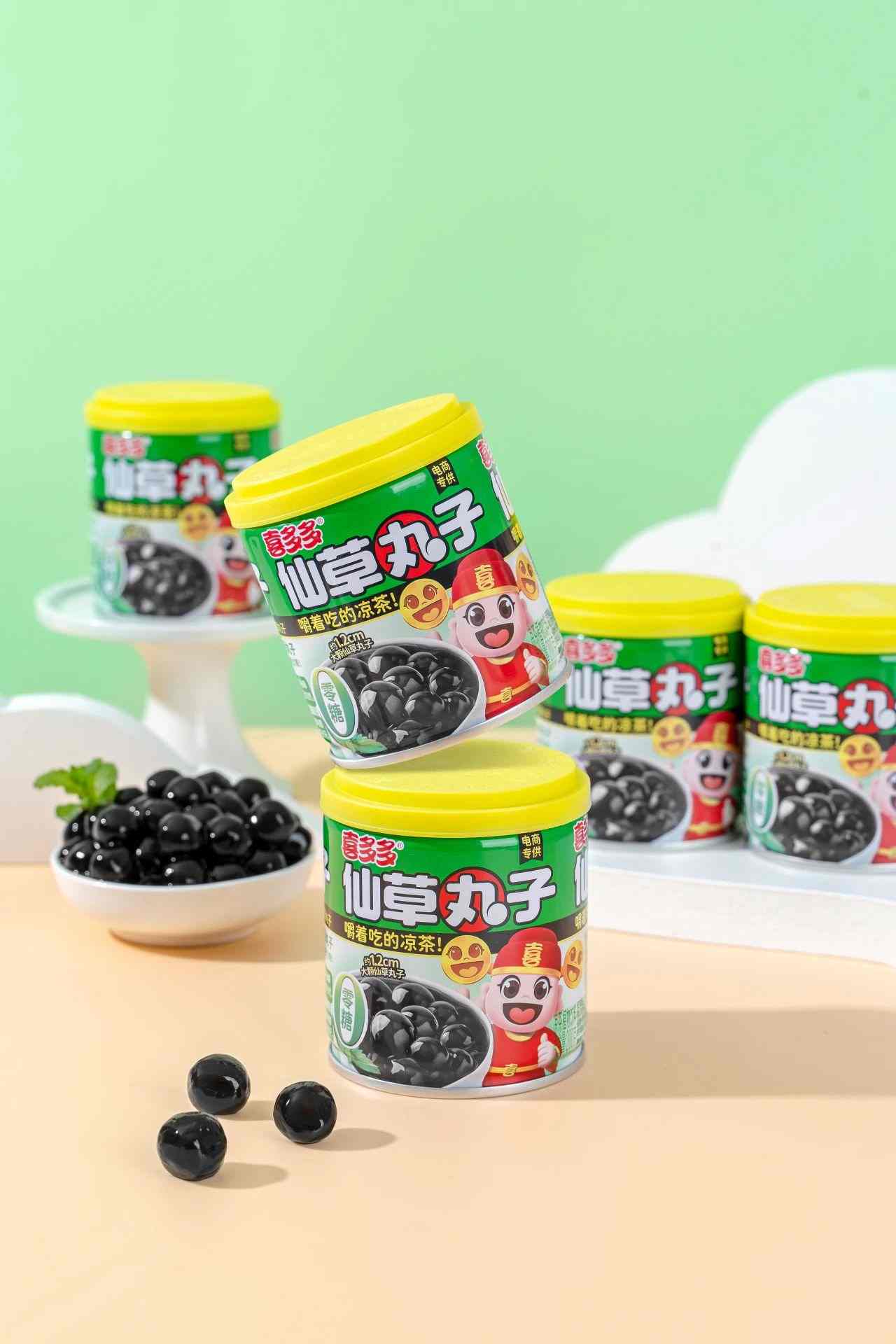 喜多多首創的球形仙草丸子顆粒設計,可以嚼著吃的涼茶,更賦予飲品獨特的咀嚼趣味,重新定義即飲植物飲料的體驗邊界。約1.2cm大直徑仙草粉圓,嚼起來比傳統的奶茶珍珠,脆啵啵等產品的口感更為Q彈。百變的吃法可以替代日常的奶茶小料,加牛奶、加奶茶、加咖啡亦是很好的選擇。