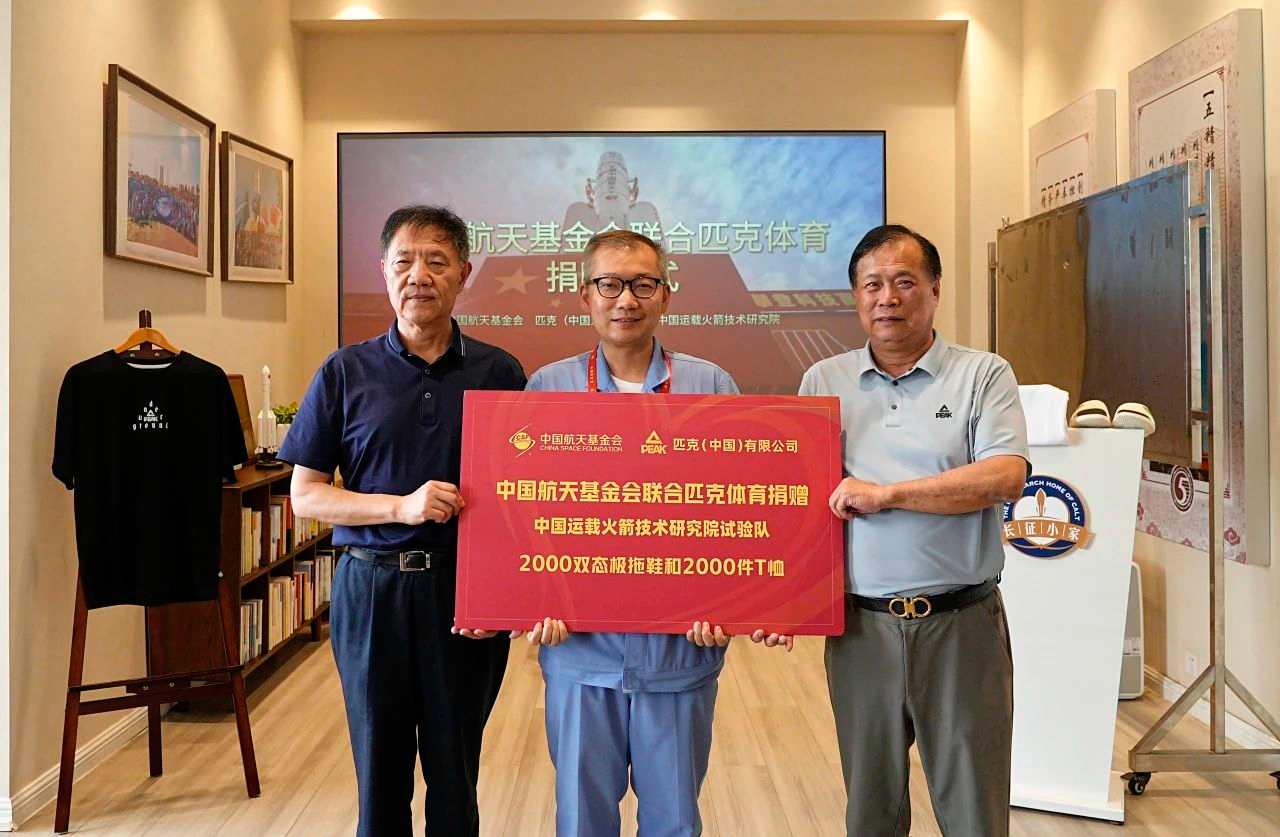 儀式現(xiàn)場(chǎng),中國航天基金會(huì)吳志堅(jiān)理事長(zhǎng)與匹克集團(tuán)許景南董事長(zhǎng)共同向試驗(yàn)隊(duì)代表授捐贈(zèng)牌。此次捐贈(zèng)的2000雙匹克態(tài)極拖鞋與2000件匹克T恤,體現(xiàn)了對(duì)實(shí)驗(yàn)隊(duì)員的支持與關(guān)愛,助力他們以更飽滿的狀態(tài)投入任務(wù)執(zhí)行。