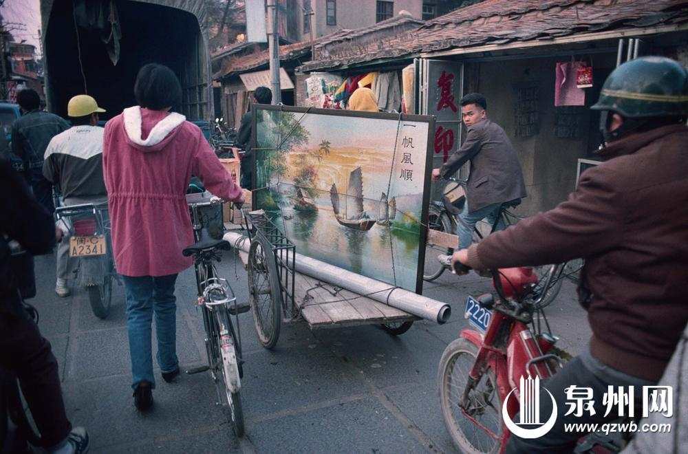 1996年,泉州,十字路口,一輛三輪車載著一幅繪有帆船的畫。