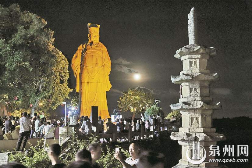 夜幕降臨,在燈光的點綴下,洛陽橋北的蔡襄雕像熠熠生輝。