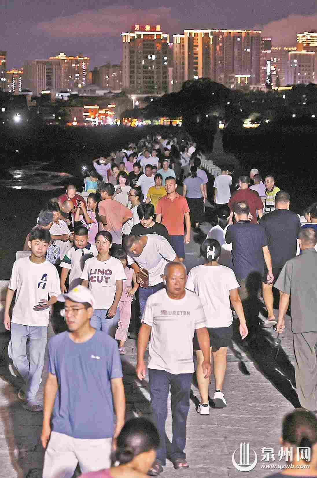 三伏末尾,泉州持續高溫,不少市民選擇“晝伏夜出”,在夜晚尋覓一方清涼。作為世遺點的洛陽橋褪去白日的喧囂,在月光與燈影的交相輝映下,成為市民游客松弛漫步、避暑納涼的絕佳去處。