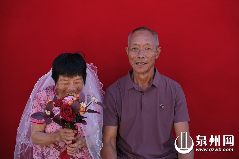 72歲的林奶奶和75歲的陳爺爺已結(jié)婚50年,他們身著樸素、整潔的衣裳,手牽手站在鏡頭前。林奶奶戴著頭紗,手捧鮮花,臉上洋溢著少女般的羞澀與幸福;陳爺爺則挺直腰板,眼神中滿是溫柔與寵溺。“我們結(jié)婚那會(huì)兒,連張像樣的照片都沒有,現(xiàn)在鄉(xiāng)里給我們拍這么好看的照片,真是圓了我們的一個(gè)夢(mèng)。”陳爺爺感慨萬千。