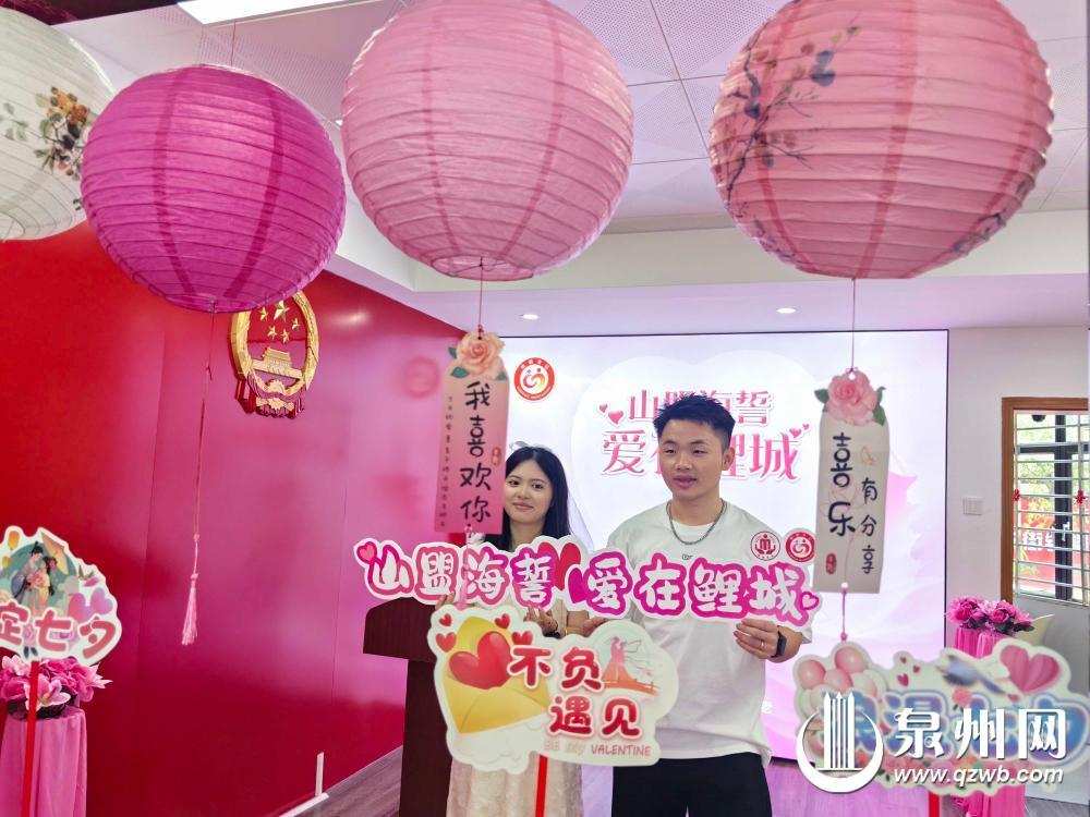登記現場,工作人員貼心準備了泉州特色簪花、頭紗、錦鯉魚燈以及“七夕限定”情話牌等拍照道具,搭配浪漫布景,為新人們打造專屬的儀式體驗。“看這里,結婚證輕輕靠在一起,頭碰頭,到白頭!”在頒證臺前,新人們佩戴簪花、手持“紅本本”拍照打卡,工作人員不時上前幫忙,定格下一張張幸福的面龐。