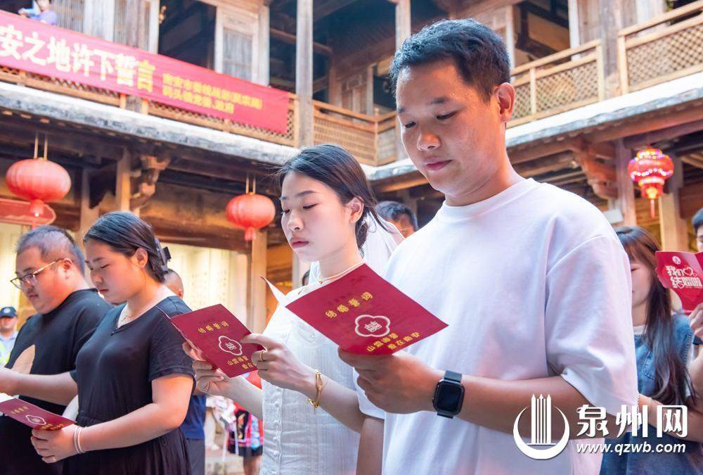 昨日,2025年南安市新時代文明實踐進農村暨“我們的節日·七夕”——“古韻畬風·愛在南安”在碼頭鎮鋪前村鋪前土樓拉開帷幕。七夕主題集體頒證活動在鋪前土樓溫馨而淳樸的氛圍中舉行。8對新人在眾人的見證和祝福中宣讀結婚誓言并領取結婚證書。新人代表還現場宣讀“節儉辦婚禮 文明新婚俗”倡議書,倡導時尚新風,樹立文明婚俗新觀念。書法家們現場揮毫,根據新人故事定制并手寫婚聯,筆鋒流轉間傾注美好祝福,既讓新人在筆墨里感受傳統文化魅力,也以定制婚聯為證,見證二人緣定今生的浪漫時刻。在百年龍眼樹下,參與者還取紅色綢帶,以筆書寫未來期許,再將綢帶輕輕掛上枝頭,每一縷紅色都承載著對“甜蜜圓滿”的向往。