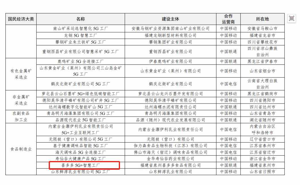 此次評選經(jīng)地方推薦、專家評審等多輪嚴(yán)格程序,全國共遴選出560個(gè)5G工廠項(xiàng)目,涵蓋48個(gè)行業(yè)。福建省共有38個(gè)項(xiàng)目入選,喜多多是唯一一家入圍的福建食品制造企業(yè),這份殊榮無疑是對其多年來在智能制造領(lǐng)域深耕的高度肯定。