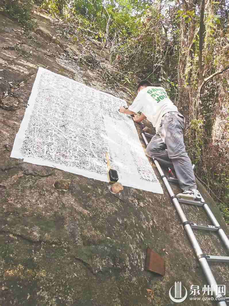 蘇先生清理石刻表面的泥土青苔 (“閩行者” 攝)