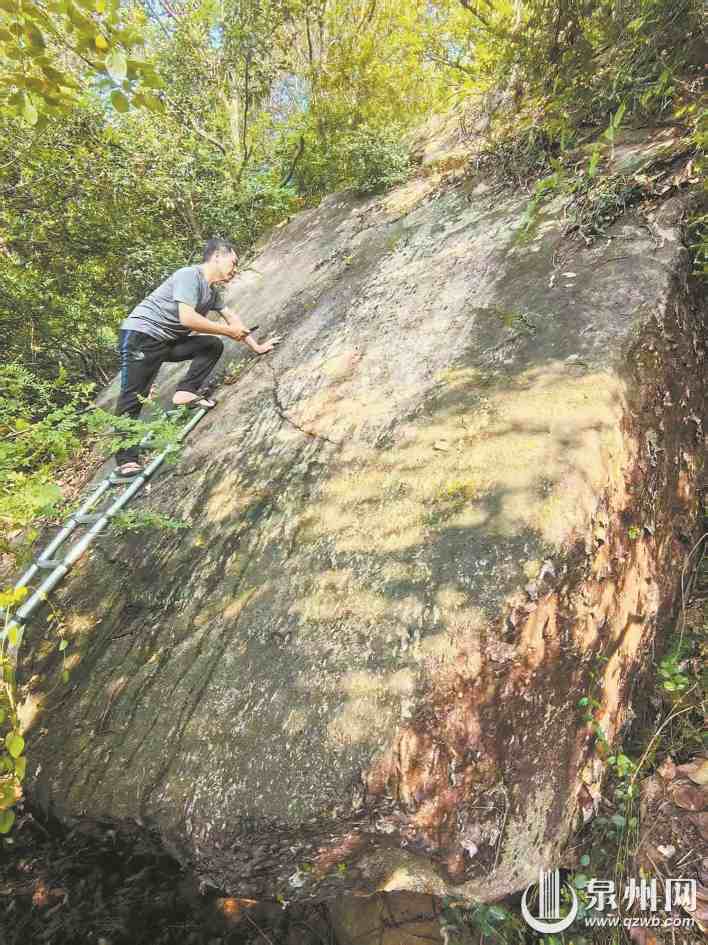 蘇先生也是文史愛好者,他從小就知道這方石刻的存在,只是因石刻深藏在茂密的藤蔓、荊棘和樹木間,一直未能成行。幾天前,他終于找到機會,與“閩行者”一同考證這方石刻。他們清除藤蔓、荊棘,小心翼翼地清理掉石刻上面的青苔、落葉和泥土。