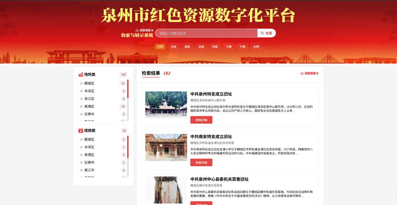 時值中國人民抗日戰爭暨世界反法西斯戰爭勝利80周年,該平臺依托數字化技術,系統整合全市紅色資源,打造多維展示、輕量交互的紅色文化傳播新陣地。平臺以市委黨史和地方志研究室2025年編纂出版的《泉州紅色文化遺存通覽》為基礎架構,首批納入182處紅色資源,涵蓋重要紅色舊址、遺址、革命領導人舊居、活動地、紀念設施及場所等紅色資源,覆蓋全市各個縣(市、區),實現紅色資源的數字化建檔與呈現。
