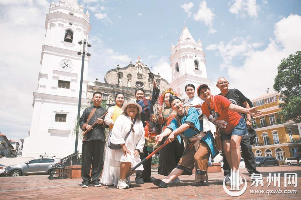 9月22日,泉州文旅推介小分隊來到巴拿馬首都巴拿馬城開展“宋元中國 海絲泉州”文旅推介,在老城區海濱步道、巴拿馬城大教堂等人流聚集區開展快閃活動,讓當地居民和游客了解體驗簪花、高甲戲、提線木偶等泉州傳統特色文化。圖為泉州文旅推介小分隊在巴拿馬城的大教堂前與當地游客合影。