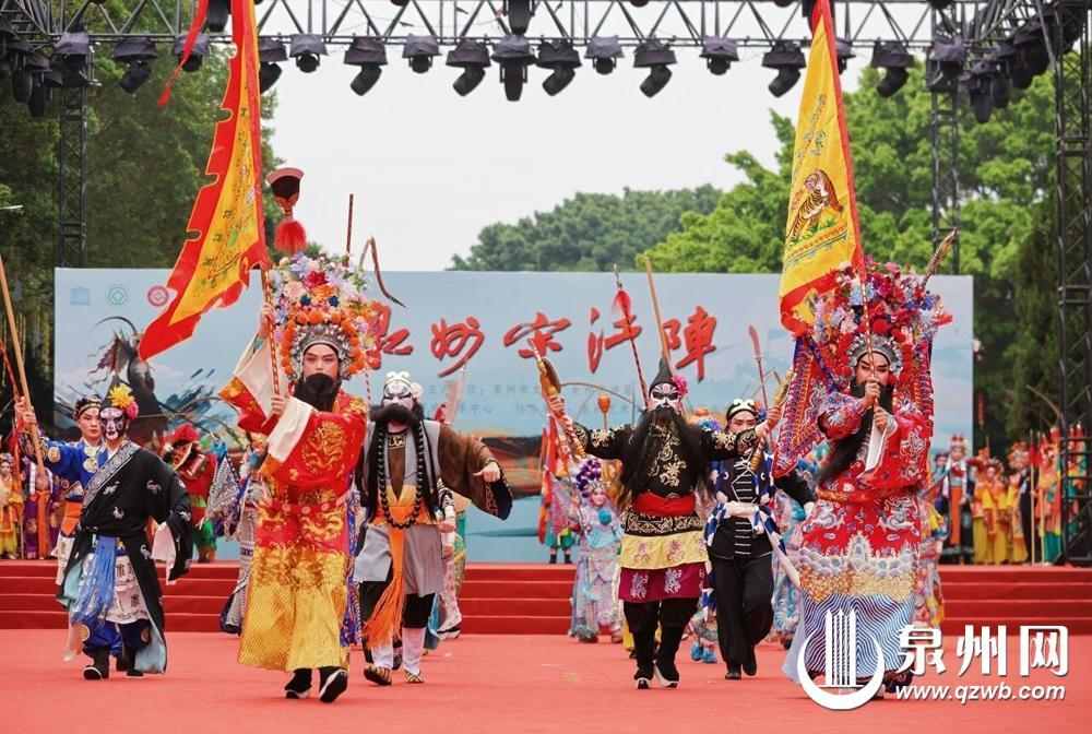 泉州宋江陣是源自明代抗倭時期的傳統武陣,2018年列入省級非物質文化遺產。其以《水滸傳》英雄為原型,表演者持兵器演練陣法,融合武術、戲劇和民俗儀軌,表演時陣勢磅礴、鑼鼓喧天,體現了閩南人崇文尚武的精神特質。值得一提的是,此次泉州文旅特邀潮汕英歌舞聯合演出,以跨區(qū)域藝術碰撞為演出注入新的血液。