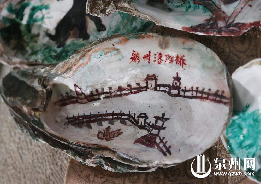 在洛陽橋南的一間小店里,一個特別的展柜陳列著數十枚生蠔殼,殼面上描繪著東西塔、洛陽橋、老君巖等泉州地標,以及各種花鳥圖案。這些獨特的畫作出自90歲的退休教師劉以符之手。