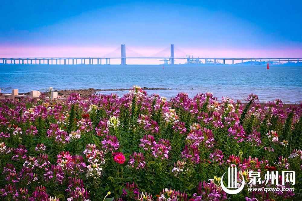 秋日,泉州中心市區豐海路濱海公園的花海在海風的吹拂下搖曳著,形成一幅色調明快的水彩畫。 (陳曉東 攝)
