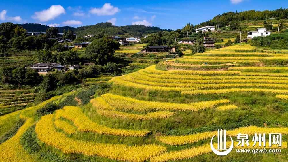 近日,德化縣龍門灘鎮霞碧村的梯田迎來水稻豐收季。金色梯田與青綠山林、古樸村莊相映成趣,宛如天然調色板。(陳小陽 許華森 許永源 攝)