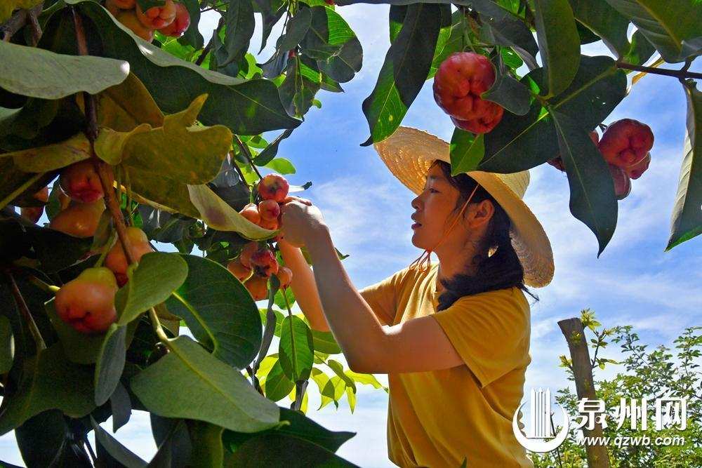 在泉港區涂嶺鎮的生態果園內,蓮霧果樹迎來采摘季。(洪坤澤 陳曉東 攝)
