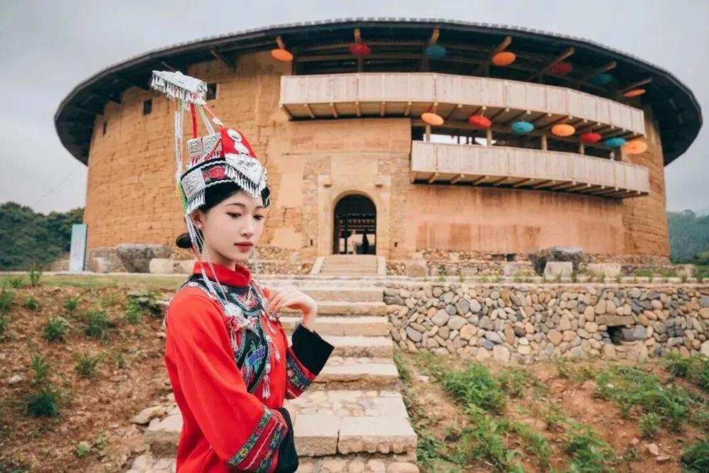 女生把自己與福建圓形土樓的合影修得色調(diào)溫潤 (圖源:清爽華安)
