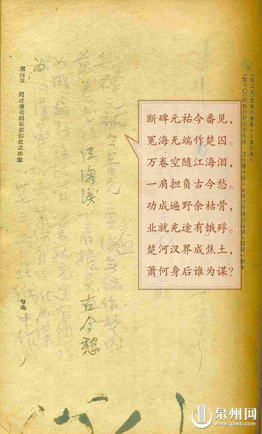 1948年3月4日,陳泗東在《中國史學史》的內(nèi)頁寫下一首七律:“斷碑元祐今番見,冤海無端作楚囚。萬卷空隨江海淚,一肩擔負古今愁。功成遍野余枯骨,業(yè)就充途有餓殍。楚河漢界成焦土,蕭何身后誰為謀?”
