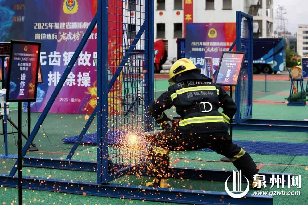 無齒鋸故障排除操中,爭分奪秒地更換高壓包、鋸片,快速穿戴好裝備到切割區鋸斷鐵絲網;無人機偵查技能比賽中,操控無人機依次飛過障礙板、龍網,飛到熱源偵查區域進行熱源偵查;高層建筑火災撲救協同綜合搶險救援比賽中,迅速完成著裝登車,駕駛參賽車輛依次通過單邊橋、進行途中清障、通過直角轉彎,同步開展火情偵察、外部控火、內攻搜救……10月21日上午,2025年福建省消防救援隊伍崗位練兵“龍虎榜”比武競賽拉開帷幕。賽場上,泉州市消防救援支隊參賽指戰員以優良的作風和過硬的素質,展現“能謀善戰、敢拼善贏”的泉州消防精神。