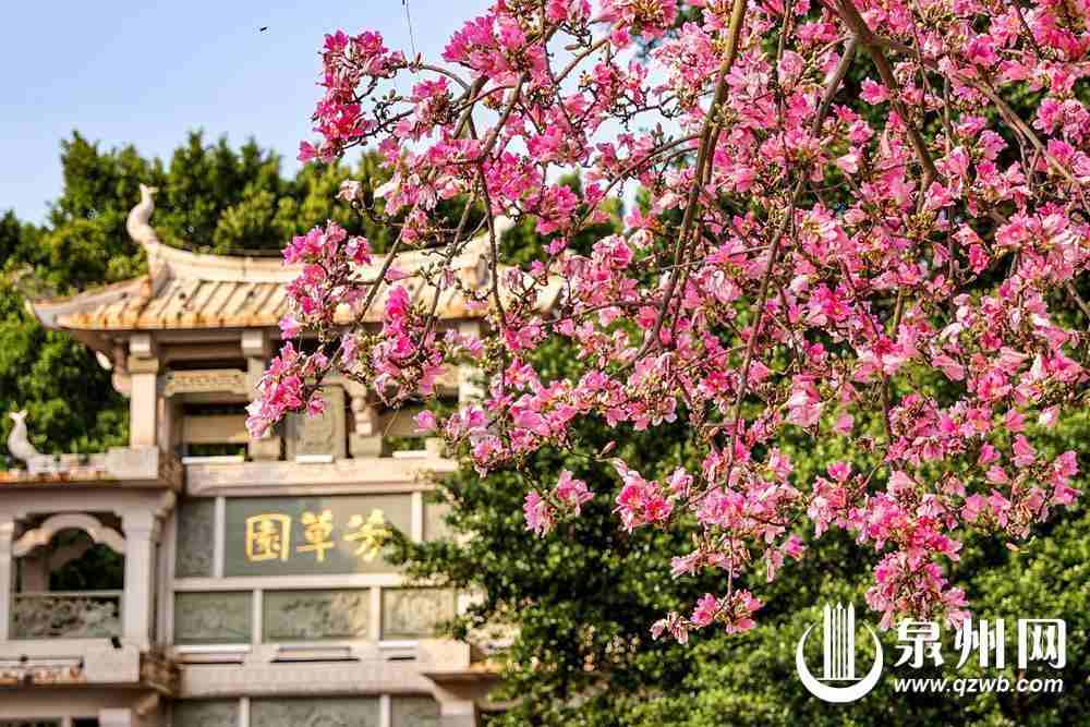 若想感受更豐富的秋冬色彩,不妨前往小山叢竹與芳草園。這是近距離、沉浸式擁抱秋冬繁花的好地方。小山叢竹公園是泉州舊八景之一的園林,既藏著朱熹講學的文脈,也留著弘一法師圓寂的晚晴室。誠正堂邊,幾棵欒樹枝繁葉茂,黃的花、紅的果層層疊疊,風一吹便簌簌落在地上,星星點點很是浪漫。逛累了,可到書院圖書室小坐片刻,或于過化亭歇腳。秋冬之際的芳草園是另一番明媚。兩排異木棉正熱烈盛放,粉色花朵層疊如霞,在陽光下格外絢爛。漫步其間,仿佛踏入粉色童話世界,花香縈繞,每一步都踩著秋冬的浪漫,讓松弛感在行走中慢慢沉淀。
